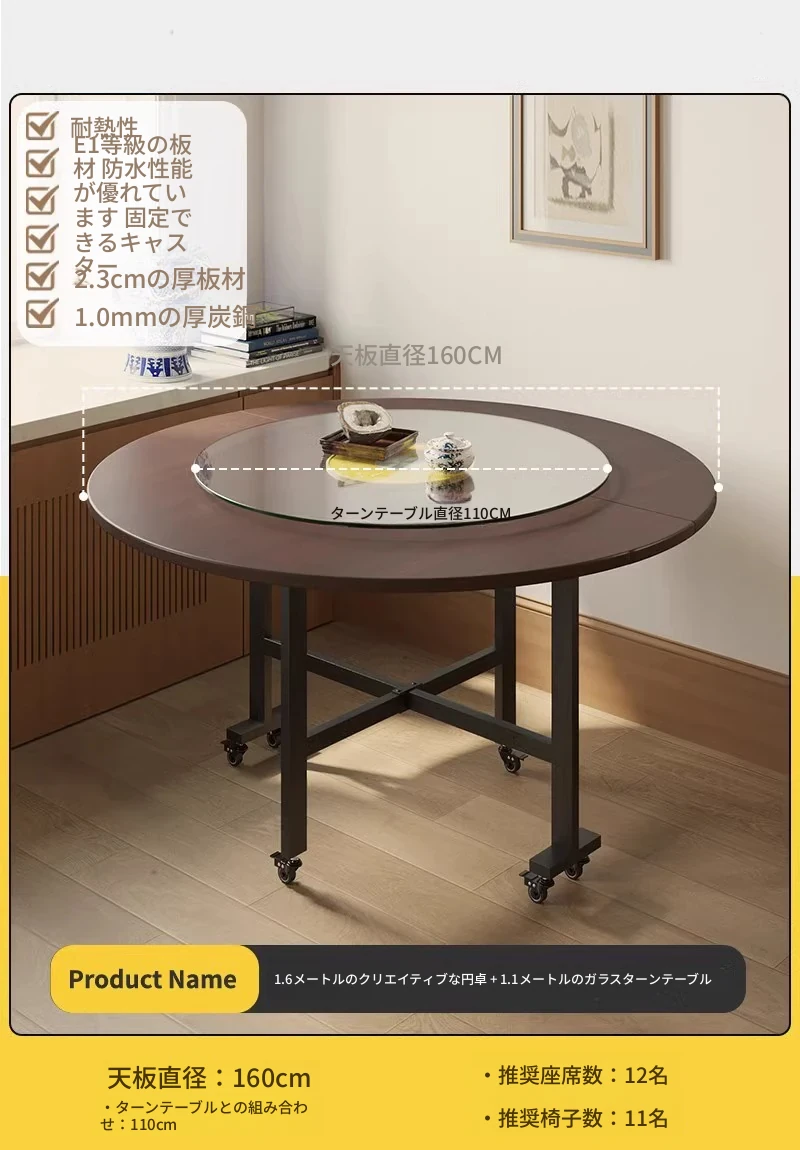 1.6メートル【ブラックウォールナット折りたたみ大円卓】+1.1ガラス回転台