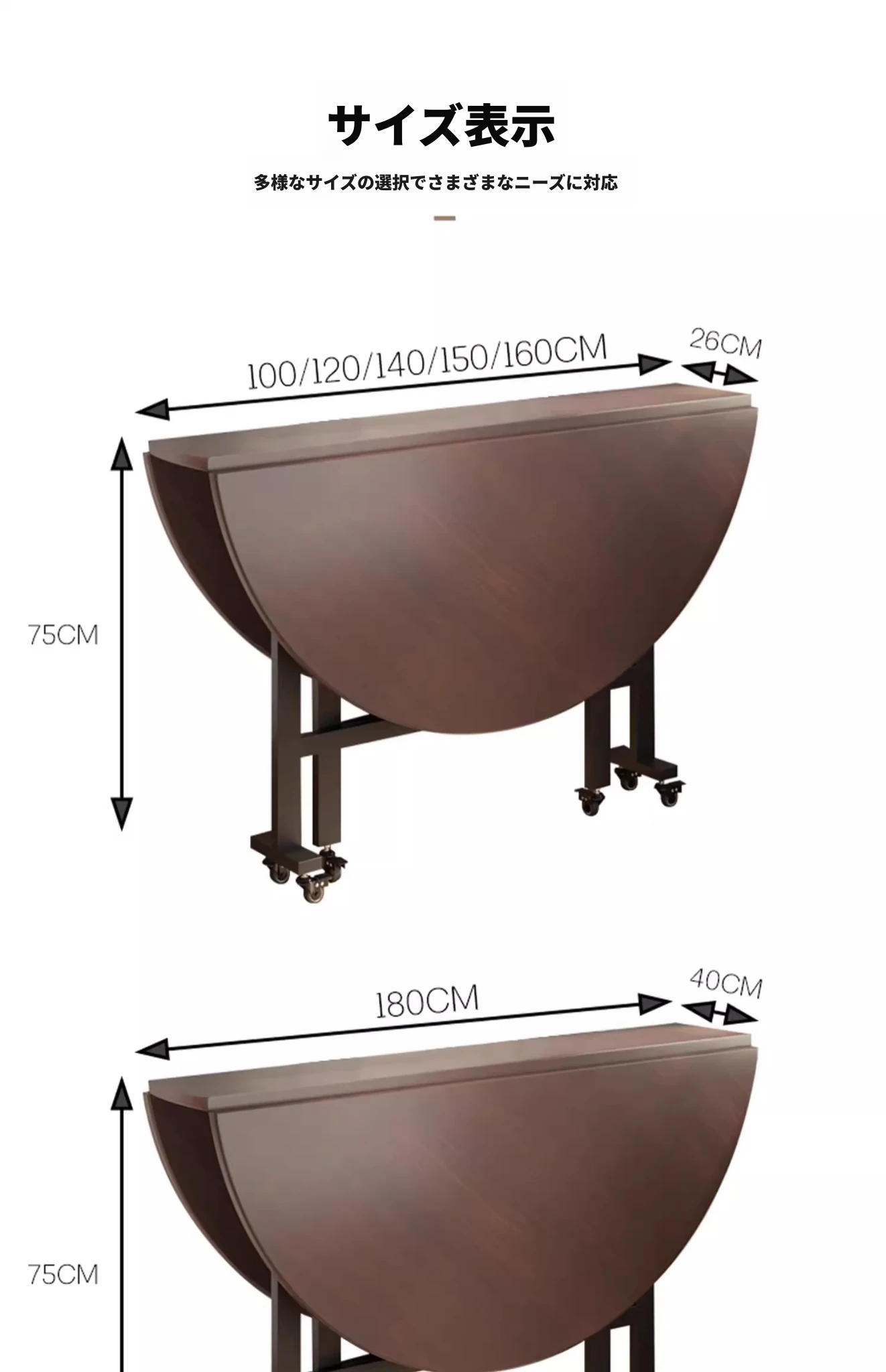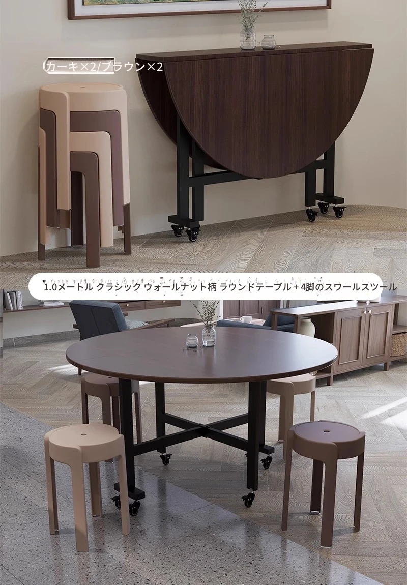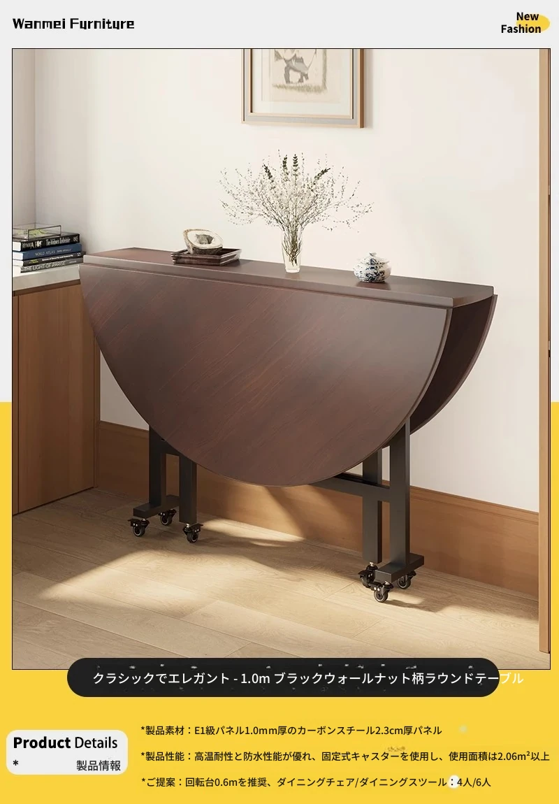 「ベストセラー」1.0メートル【ブラックウォールナット折りたたみラウンドテーブル】〃クラシックでどんなスタイルにも合う 4-6人用★キャスター付き
