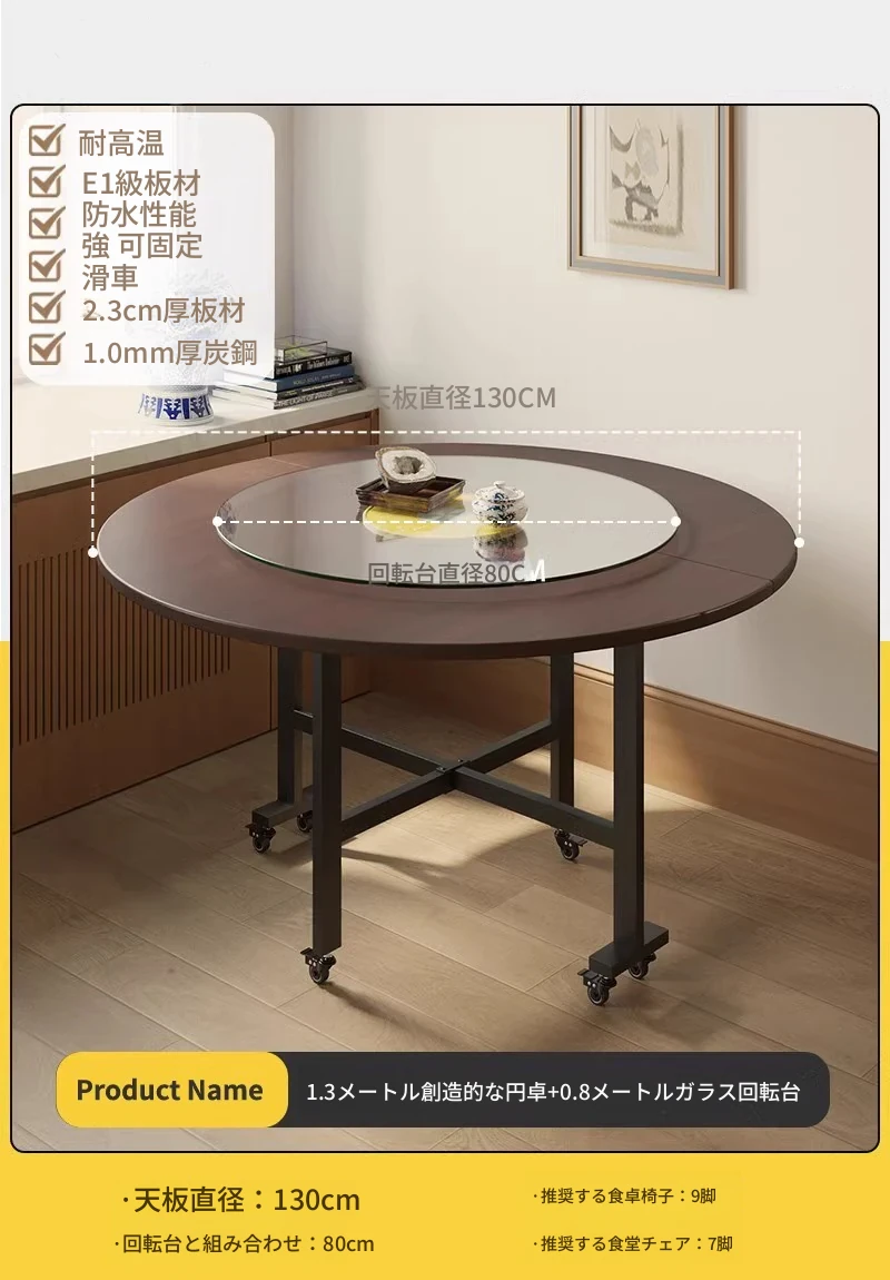 1.3メートル【ブラックウォールナット折りたたみ大円卓】+0.8ガラス回転台